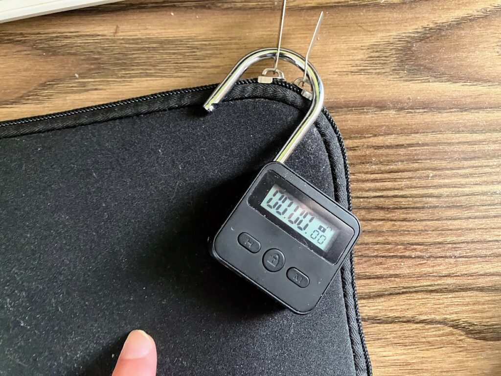 見た目よりプラスチックの厚さがあって耐熱ガラスの食器のような感じ。透明なのに重くて重厚感がある。上のタイマーから飛び出たバーが、下の容器に空いた穴を貫通してロックする形なのでまず開けられない。タイマーの電池を抜けば時間は保存されたまま停止するので完璧にこの商品の役割を果たしている。